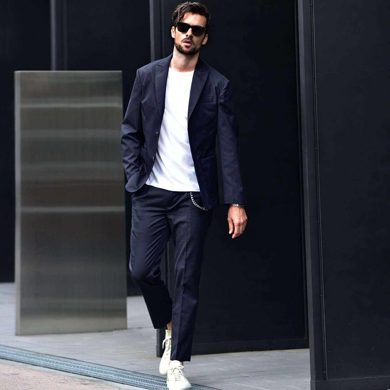素材感はちょっと違いますが、ブラックのカジュアルセットアップスーツにTシャツ&スニーカーのお洒落スタイリング。