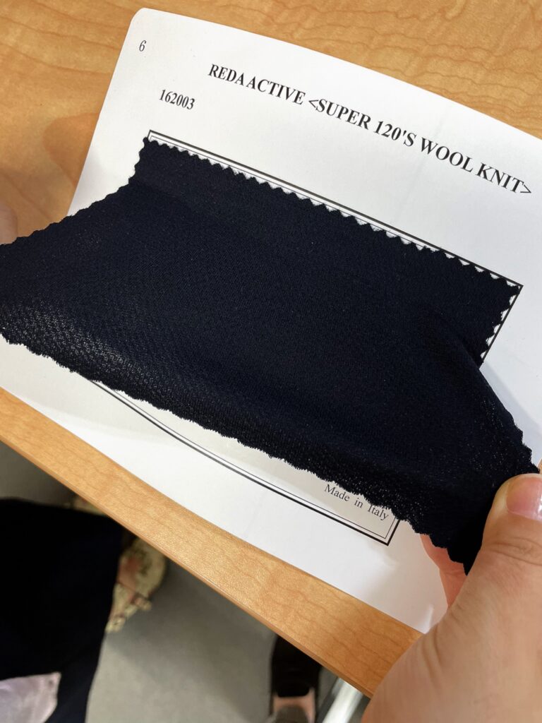 今回のお客様にはこの生地を使って、先日ご紹介させていただいた〝ドローコードパンツ〟仕様にしたカジュアルスーツをお仕立てさせていただきます。