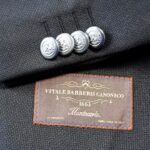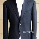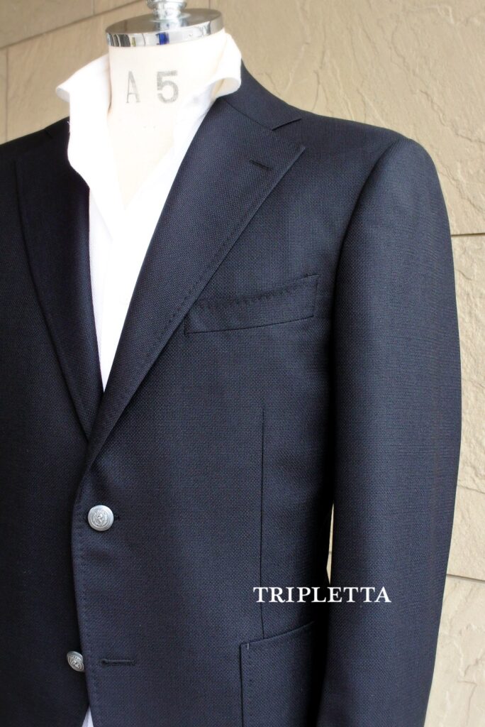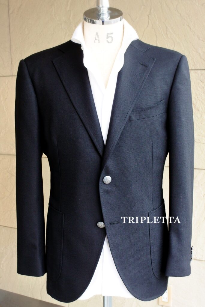 通常のブラックジャケットではなく、メタルボタンを使用しブレザー風にすることでトラッドな印象に変わります。