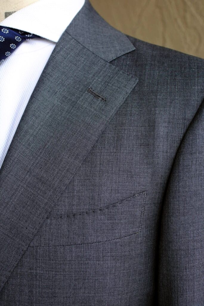 今回ご注文いただいたグレーのシャークスキン生地は、光の加減で表情が変わる繊細な織りが特徴。