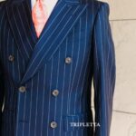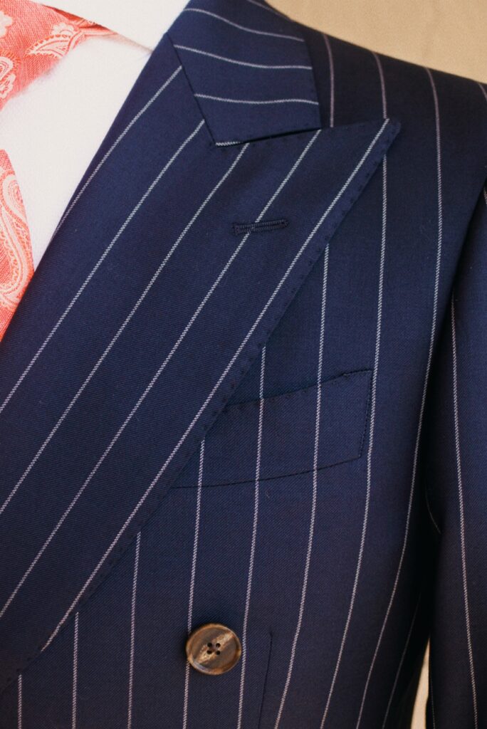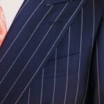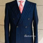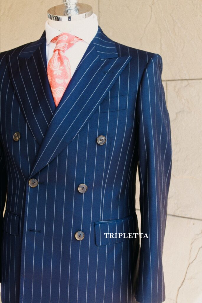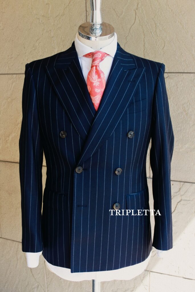 カルロ・バルベラの上質なネイビーチョークストライプ生地を使用し、クラシカルな雰囲気漂うダブルブレストスーツを仕立てました。