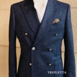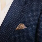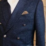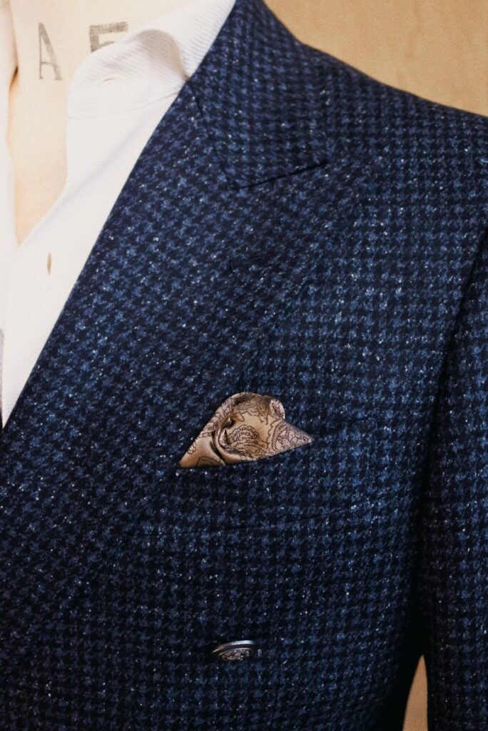 ネイビーのハウンドトゥース柄は品格と個性のバランスが絶妙で、ビジネスシーンにも馴染みながら確かな存在感を放ちます。
