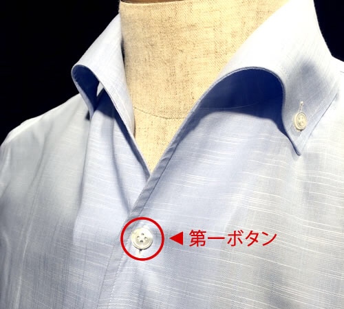 志スーツでオーダーいただくシャツは第一ボタン位置を上下に3㎝まで移動させることができます。 2つボタンを空けるスタイルもありますが、あまり空きすぎるのもチャラチャラした感じになりビジネスシーンでは思わしくありません。 その場合、第一ボタンを2~3㎝下げることで、2番目のボタンを開けずに開襟部分を広げることができます。