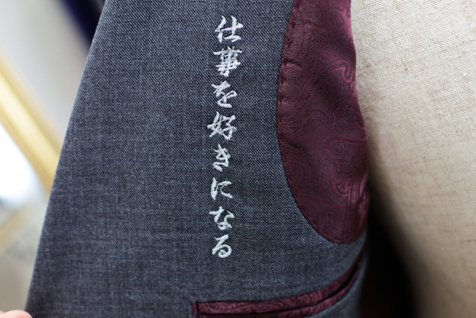 また、いつも胸には仕事に対する想いを刺繍される方のですが、今回は加藤社長自身の本年度テーマ〝仕事を好きになる〟を胸に入れさせていただきました。