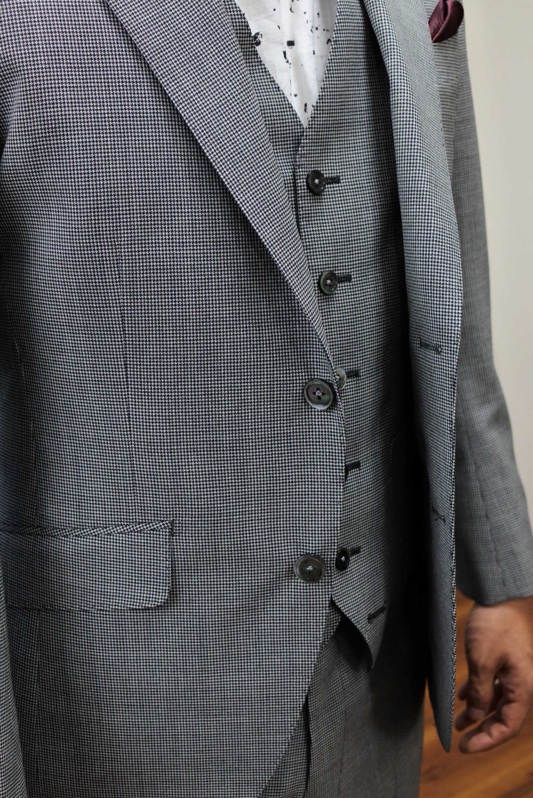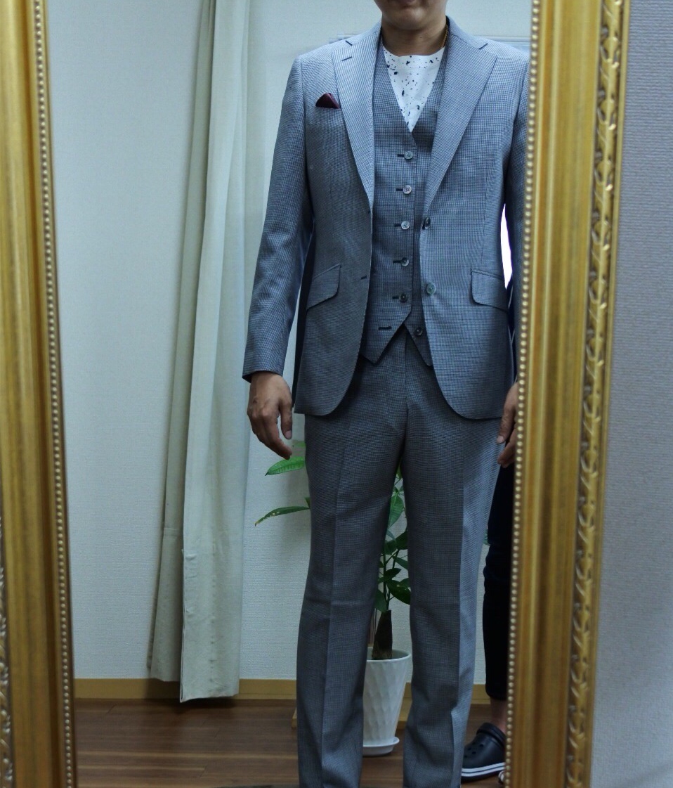 いつも志スーツをご贔屓にしてくださっているH様のオーダースリーピース。 酒類販売会社にお勤めのH様は、お得意先様の開店祝いや周年記念などで飲食店を訪問する機会も多く、当店で作っていただいたオーダースーツを営業の武器の一つとしてご愛用いただいております。 イタリア生地の千鳥格子は、一見するとグレー無地に見えますが近くでは細かい千鳥柄が散りばめられたお洒落なデザインに仕上がっています。 〝デキるビジネスマンは外見力が違う!〟 サイズの合った当店のスーツを着用したことでお得意先様の対応が変わった経験を持たれているからこそ、ビジネスシーンでは外見力が重要だとご理解されています。 H様、このスーツを着て更に仕事の成果を上げてください。 いつも応援しています。