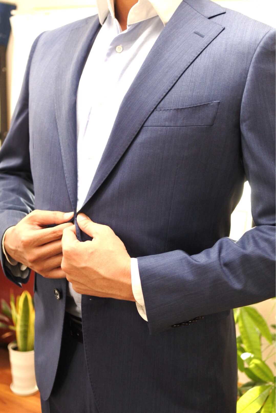 そんなY様、今回お仕立てさせていただいたのは夏らしいブルーのソラーロ素材を使用したスーツ。