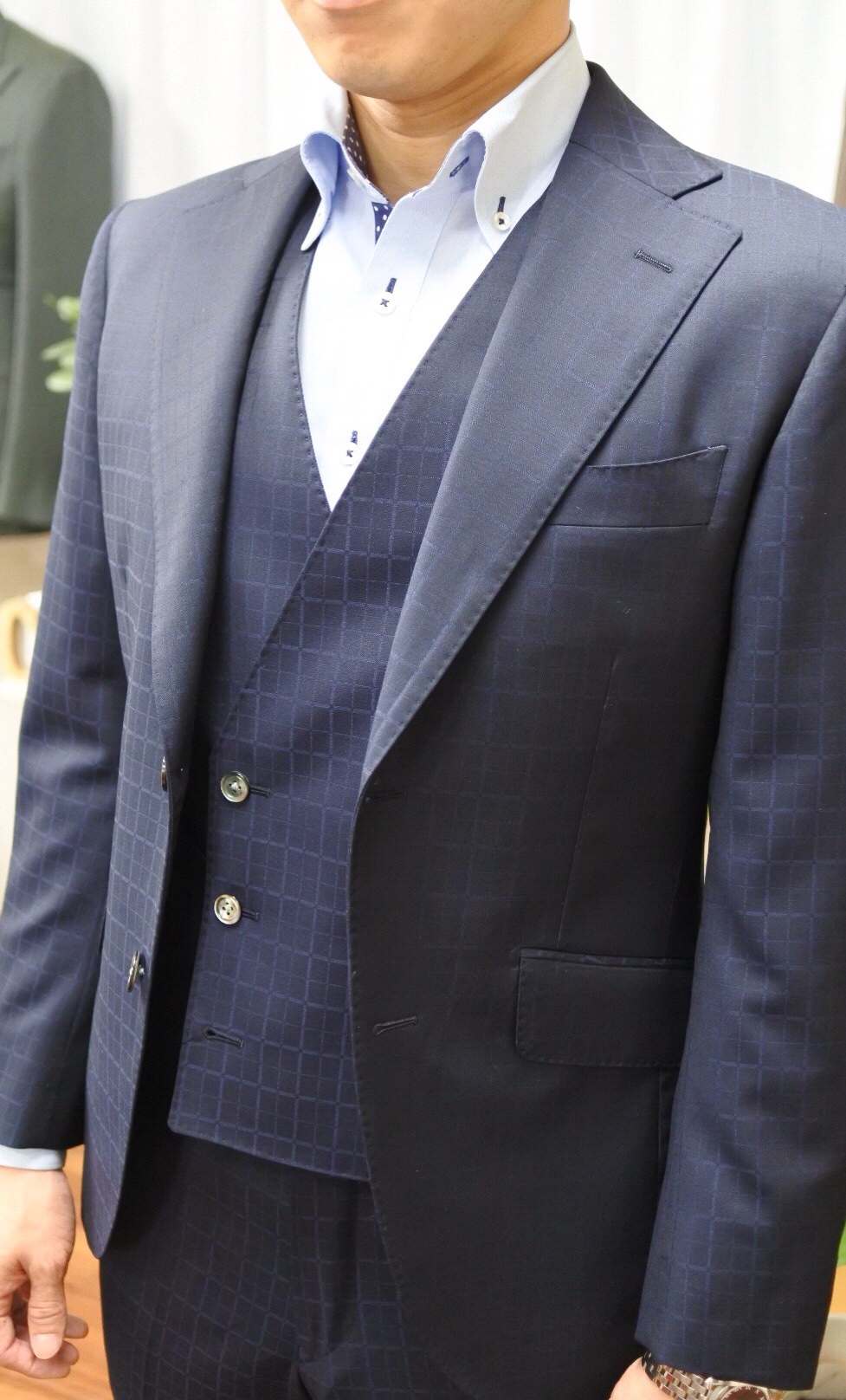 金融関係なので〝清潔感〟や〝信頼感〟がとても重要なポイントとなりますので生地はあまり主張が強くない物を選択。一見すると光沢感のあるネイビー無地ですが、近くで見ると同色のチェックがデザインされており、さりげなくお洒落に気を遣っている仕上がりにご満足いただきました。