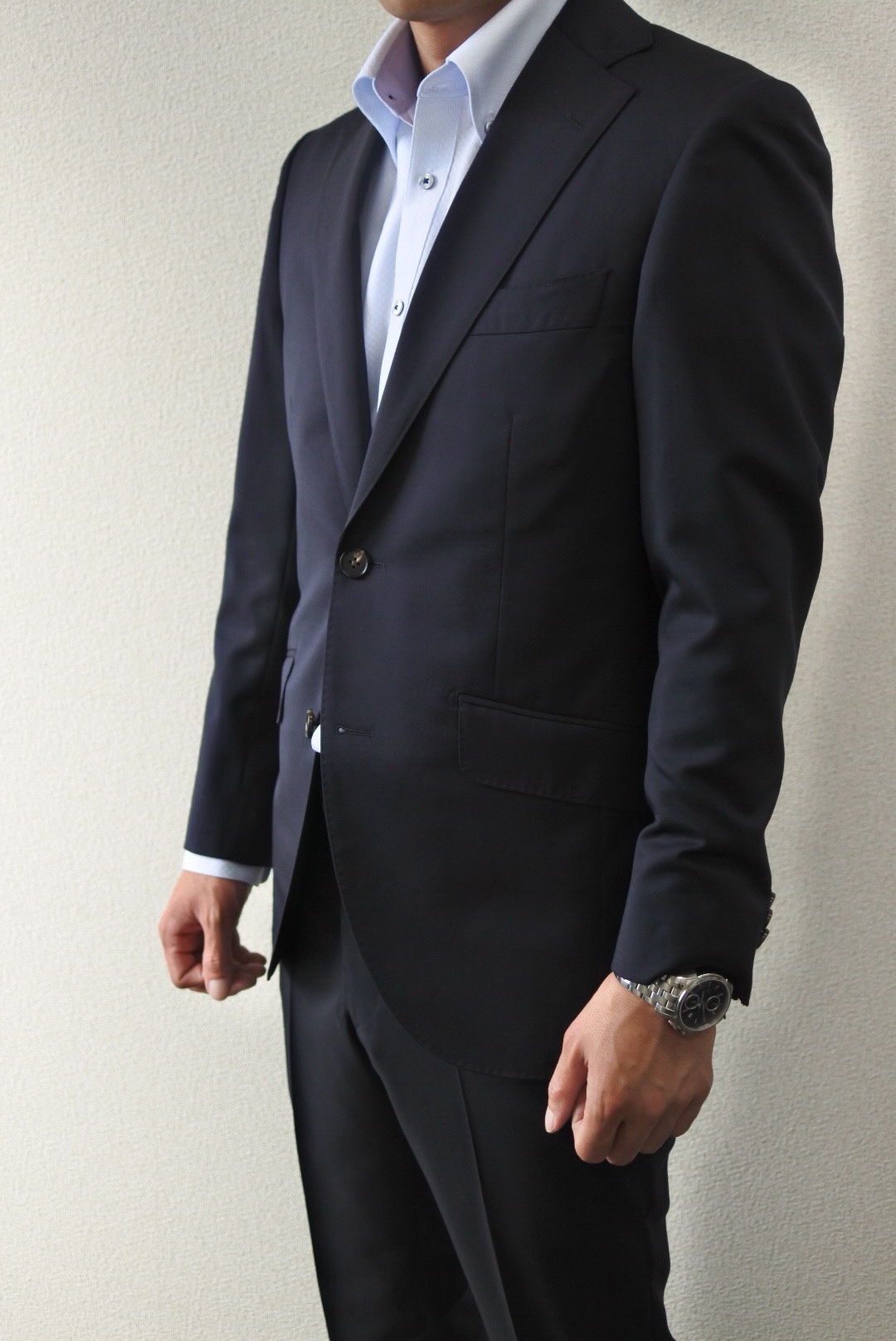 ビジネスシーンや所属団体で着用するスーツということで、国産のシンプルなネイビー生地をお選びいただきました。
