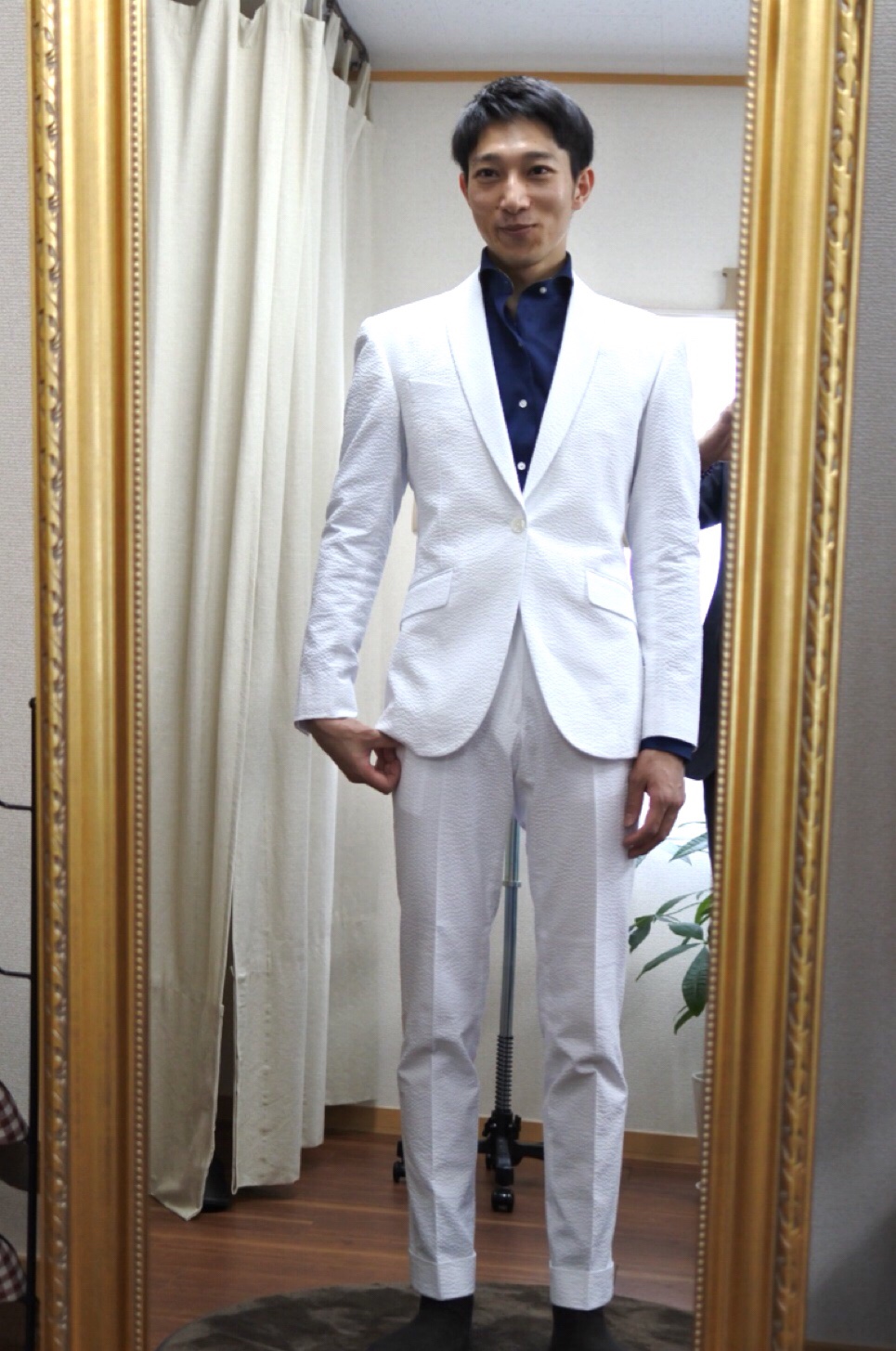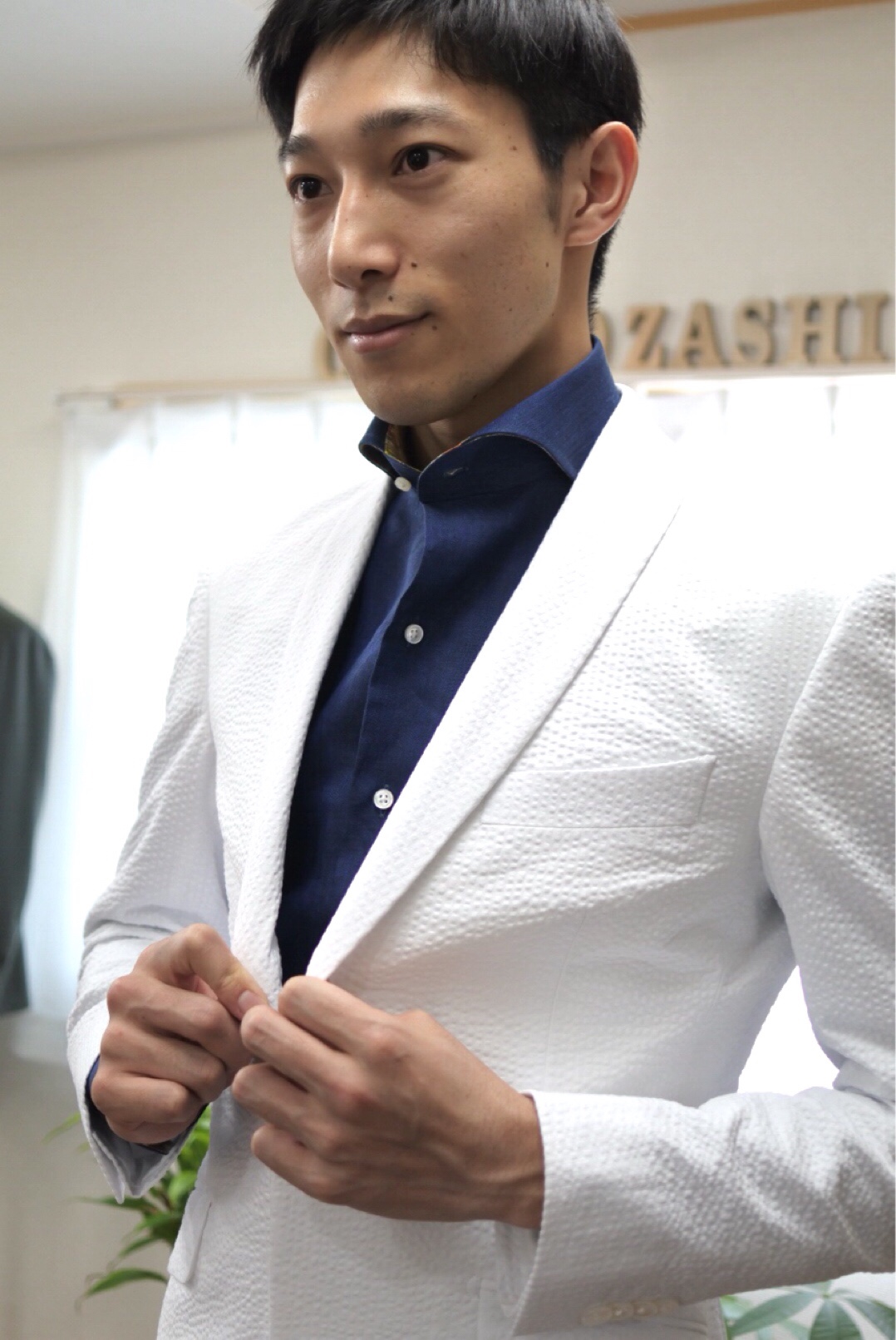 7月にご結婚されるM様に新郎用のスーツを作らせていただきました。 当初は白のタキシードをオーダーする予定でしたが、結婚記念日やレストランデートなどでの着用も考え白いシアサッカ―素材を使ったスーツに切り替えました。 シアサッカ―は細かい凹凸が特徴の夏素材でジャケットやカジュアルスーツとして人気の素材ですが、今回は結婚式がメインなのでジャケットにはタキシード感を残しショールカラーを採用、パンツもベルトレス仕様にしてあります。 同時にオーダー頂いたリネン100%のオーダーシャツもホワイトと相性が良く、お洒落なスタイリングが完成しご満足いただくことができました。 〝人生の大切な瞬間に華を添える〟 この想いこそ私がこの仕事を選んだ一番の目的であり、今回のように結婚式でご着用いただけることは本当にやりがいを感じます。 M様、奥様と幸福な家庭を築いていってください。 この度は志スーツをご利用くださり、誠にありがとうございました!