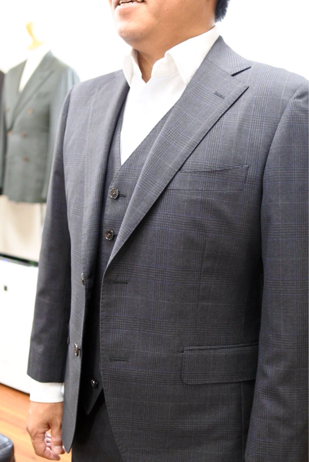 所属団体では役職も受けており人前に立つ機会が多いS様、あまり派手にせず誠実で落ち着きを感じさせる服装が望ましいと考えご提案させていただいのが、チャコールグレーのグレンチェックに上品なパープルのオーバーペンが入った生地。
