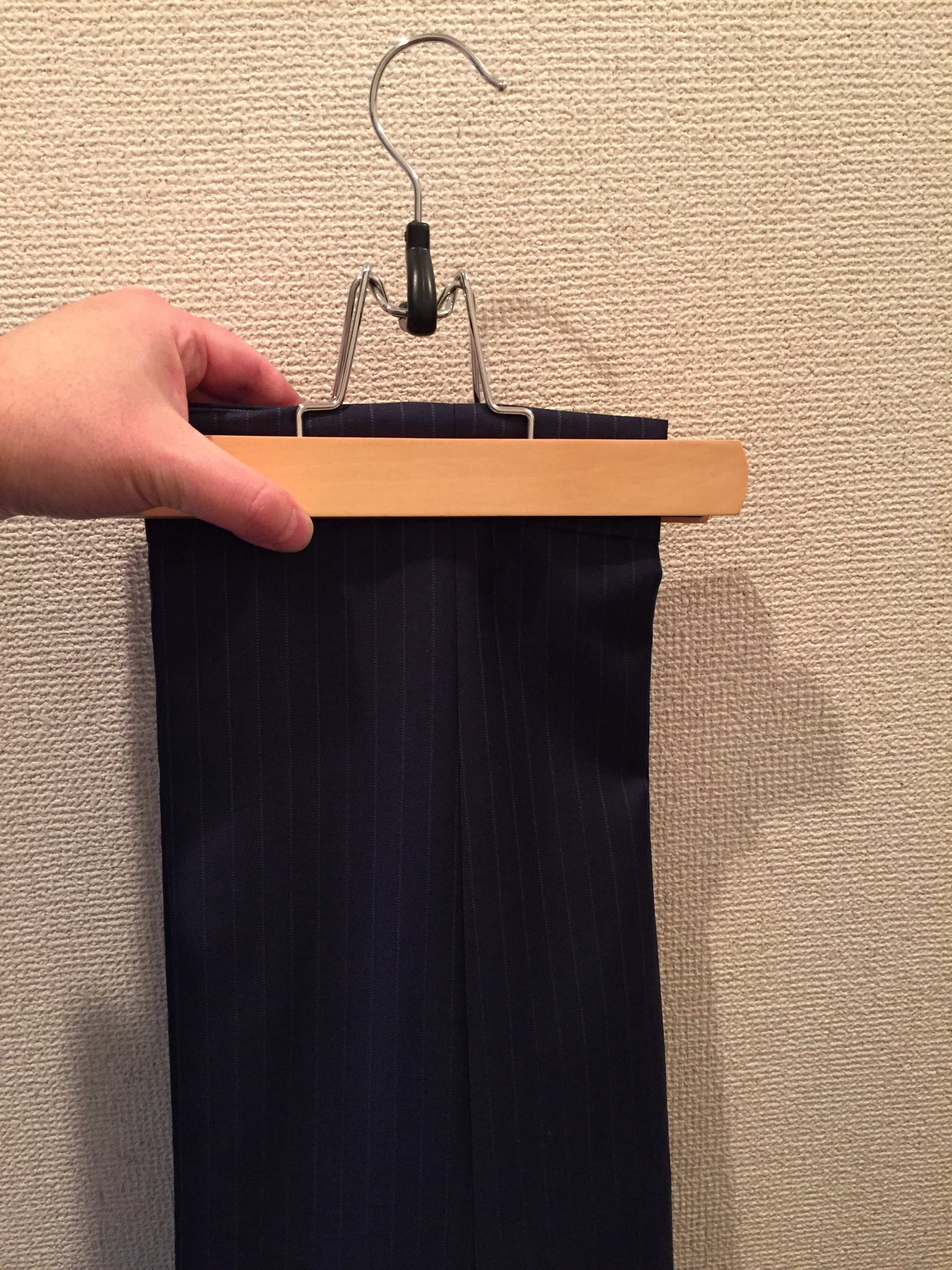 1日履いたパンツも同様に大量に汗を吸っています、ジャケット同様に乾かすことも大切ですがパンツの場合は膝裏などにシワが出ているので、そのシワは重力の力を借りることである程度はキレイに伸びます。