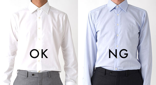 衿先をボタンで留めるボタンダウンシャツは、カジュアルに分類されるので適しません。