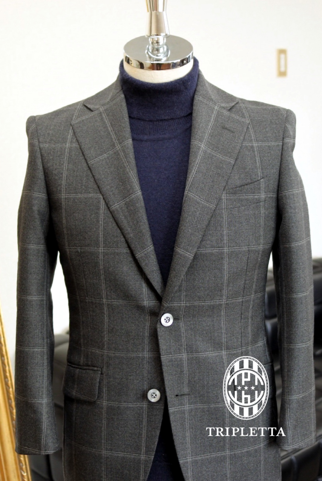 一般的なスーツはウール100%のクリアカットでツヤ感ある生地で仕立てるのがほとんどですが、ジャケットは凹凸などの素材感がある生地の方がバランスが良くなります。