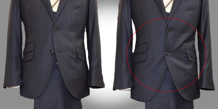 製品の構造上、一番下のボタンを外すことでヒップラインにジャケットの裾が広がり、ウエスト部分にくびれが生じ男性らしいたくましいシルエットに見えるように作られています。